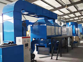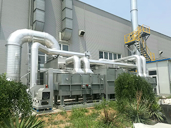 集廢氣預處理器(qì)、吸附、脫附、新(xīn)風換熱(rè)、催化燃燒、引風係(xì)統多(duō)種工序於一(yī)體。在吸附風機的作(zuò)用下,廢氣首先進入前置過濾箱體,將廢氣中的顆粒物過濾,阻截。由(yóu)前置過濾器分別(bié)進入兩側吸附脫附箱體(中間(jiān)設有旁路(lù)保溫隔層,在有機廢(fèi)氣檢測濃度達標情況下旁通閥直接開啟排放)。通(tōng)過吸附(fù)層吸附淨化有機廢氣,吸附層上方設置催化燃燒裝置,當吸附層接近飽和時,PLC控製器自動關閉進氣閥門,開(kāi)啟催化燃燒進氣閥門、催化燃燒(shāo)電(diàn)加熱器。從外部進入係統的新鮮空氣,在脫附風機的作用下經節(jiē)能裝置加熱至一定溫度後進入活性炭吸(xī)附層進行脫(tuō)附,脫附後的氣體進入催化燃燒器,在催化劑作用下氧化反應為CO2和H2O等物質;燃燒後的氣體由排(pái)氣口排出,產物無二次汙染。