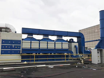 集廢氣預處理器、吸附、脫附(fù)、新風換熱、催化燃燒、引風(fēng)係統多種(zhǒng)工序於(yú)一體。在吸附風機的作用下,廢氣首先進入前置過濾箱體(tǐ),將廢氣中的顆粒物過濾,阻截。由前置過濾(lǜ)器分別(bié)進入兩側吸附脫(tuō)附箱體(中間設有旁(páng)路保溫隔層,在有機廢氣檢測濃度達標情況下旁通閥直接開啟排放)。通過吸附層(céng)吸附(fù)淨化有機廢(fèi)氣(qì),吸附層上方設(shè)置催(cuī)化燃燒裝置,當(dāng)吸附層接近飽和時(shí),PLC控(kòng)製器自動關閉進氣閥門,開啟催化燃燒進氣閥門、催化燃燒電加熱器(qì)。從外部進入係統的新鮮空氣(qì),在脫附(fù)風機的作用(yòng)下經節能裝置加熱至一(yī)定溫度後進入活性炭吸附(fù)層進(jìn)行脫附,脫附後的氣體(tǐ)進入催化燃燒器,在催化劑作用下氧化反應為CO2和H2O等物質;燃燒後的氣體由排氣口排出,產物無二(èr)次汙染。